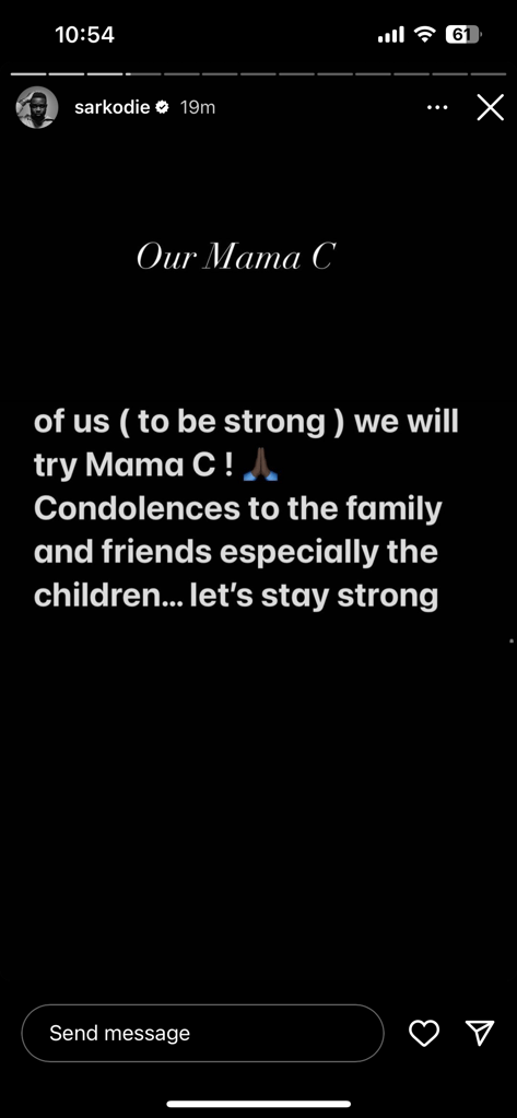 He posted, “This is going to be a very difficult one for all of us but I guess that’s the price to pay when you open up to love . It was unusual I hadn’t heard from you in these few days because knowing my mama Cee she will be the first person to text me worried then tease me … sent you a WhatsApp asking ” Mama C Na mentee wonka oo ©” but after several hours seeing two ticks I felt something was wrong then they broke the news to me. We know what you would love for all of us (to be strong ) we will try of us ( to be strong ) we will try Mama C! J. Condolences to the family and friends especially the children… let’s stay strong.”
